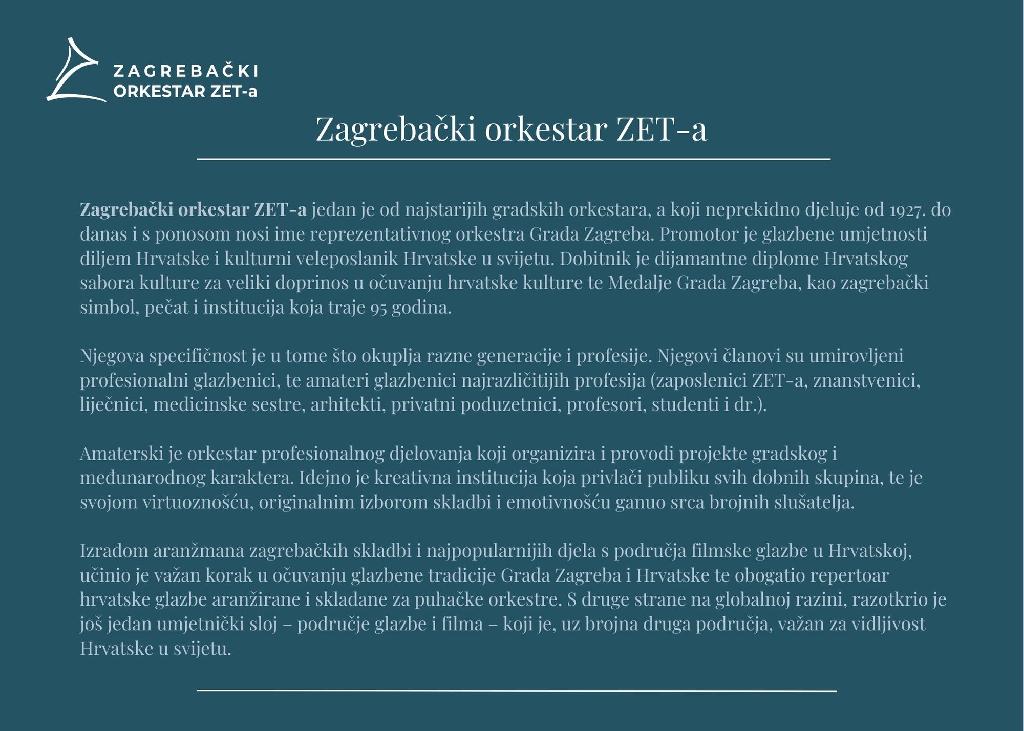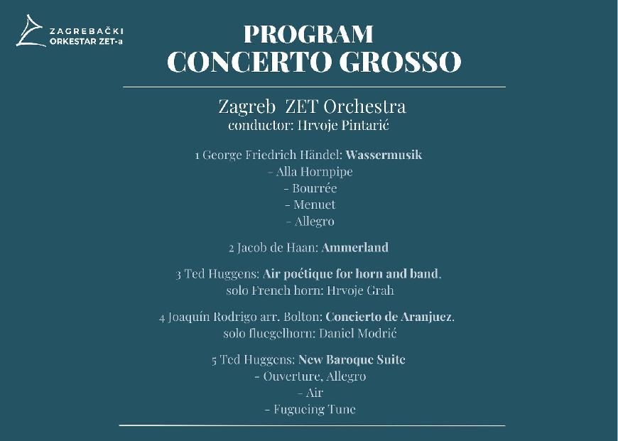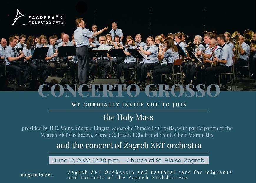 Po završetku svete mise Orkestar ZET-a održati će koncert klasične glazbe „Concerto Grosso“pod ravananjem dirigenta Hrvoja Pintarića i tako pokazati puni sjaj zvuka svojih instrumenata i umijeća. Na repertoaru su Georg Friedrich Händel: Wassermusik, Jacob de Haan: Ammerland, Ted Huggens: Air Poetique, Joaquin Rodrigo: Concierto de Aranjuez, Ted Huggens: New Baroque Suite. Koncertom će počastiti sudionike misnoga slavlja i nastaviti bogati program proslave 95 godina postojanja i neprekidnog djelovanja.