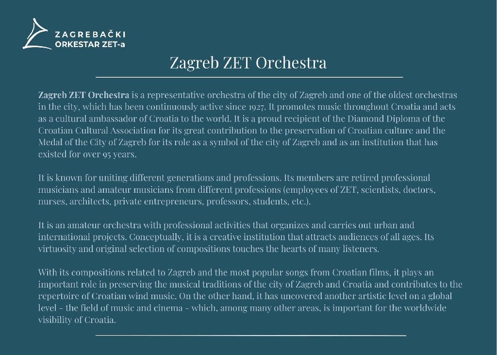 Spomenuto misno slavlje uzveličati će Zagrebački orkestar ZET-a koji ove godine slavi 95-u obljetnicu. Radi se o vrsnom puhačkom orkestru koji redovito nastupa na manifestacijama u gradu Zagrebu, a bilježi zapažene nastupe i izvan grada te na međunarodnim festivalima. Voditeljica projekata Orkestra je Jelena Horvatinec mag.ing.agr.